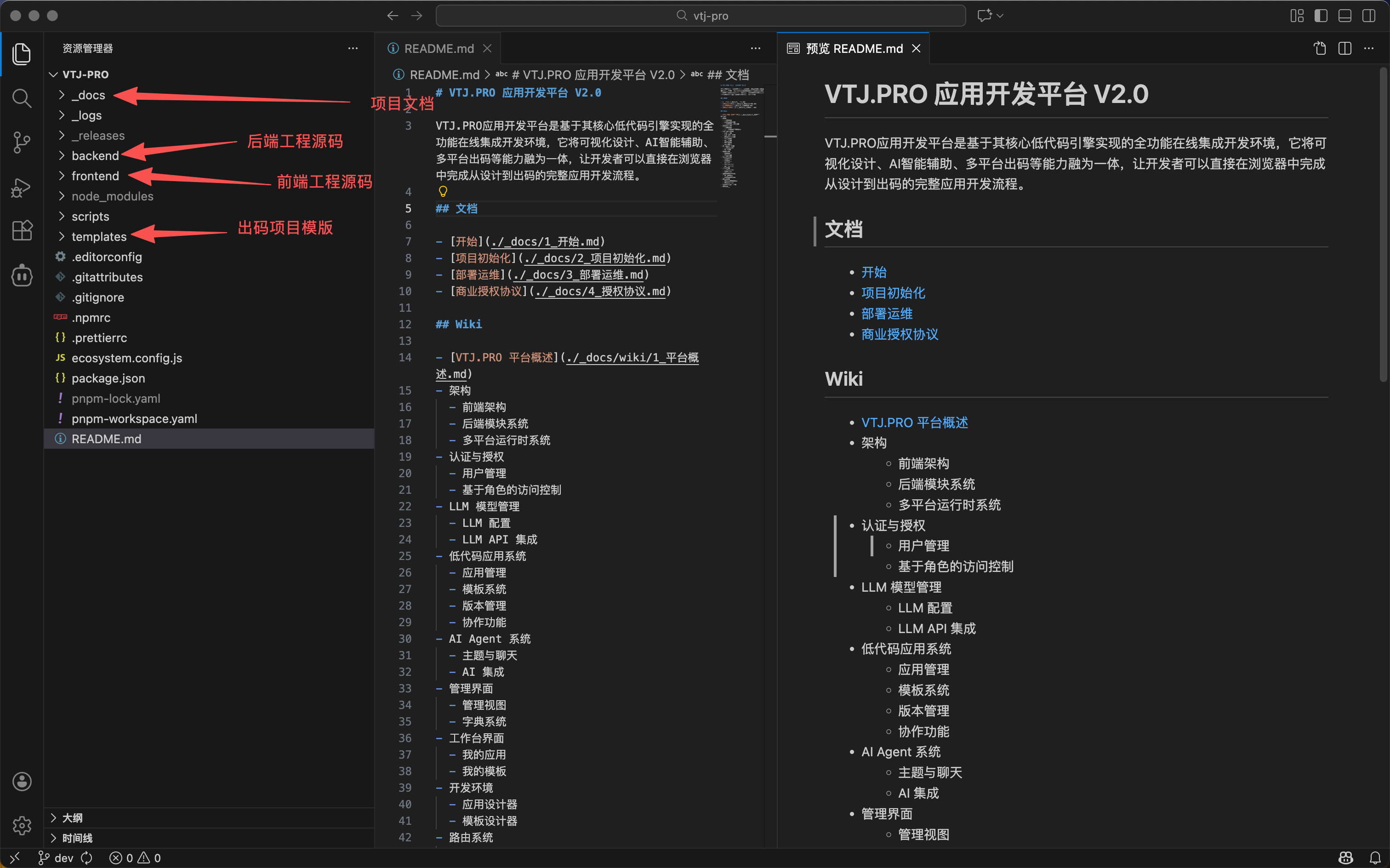 Monorepo结构,使用pnpm进行包管理 backend/目录包含完整的NestJS后端服务frontend/目录包含Vue3前端应用,支持多平台(H5、小程序、Web)templates/目录包含各平台的项目模板scripts/目录包含项目构建和部署脚本_docs/目录包含项目文档