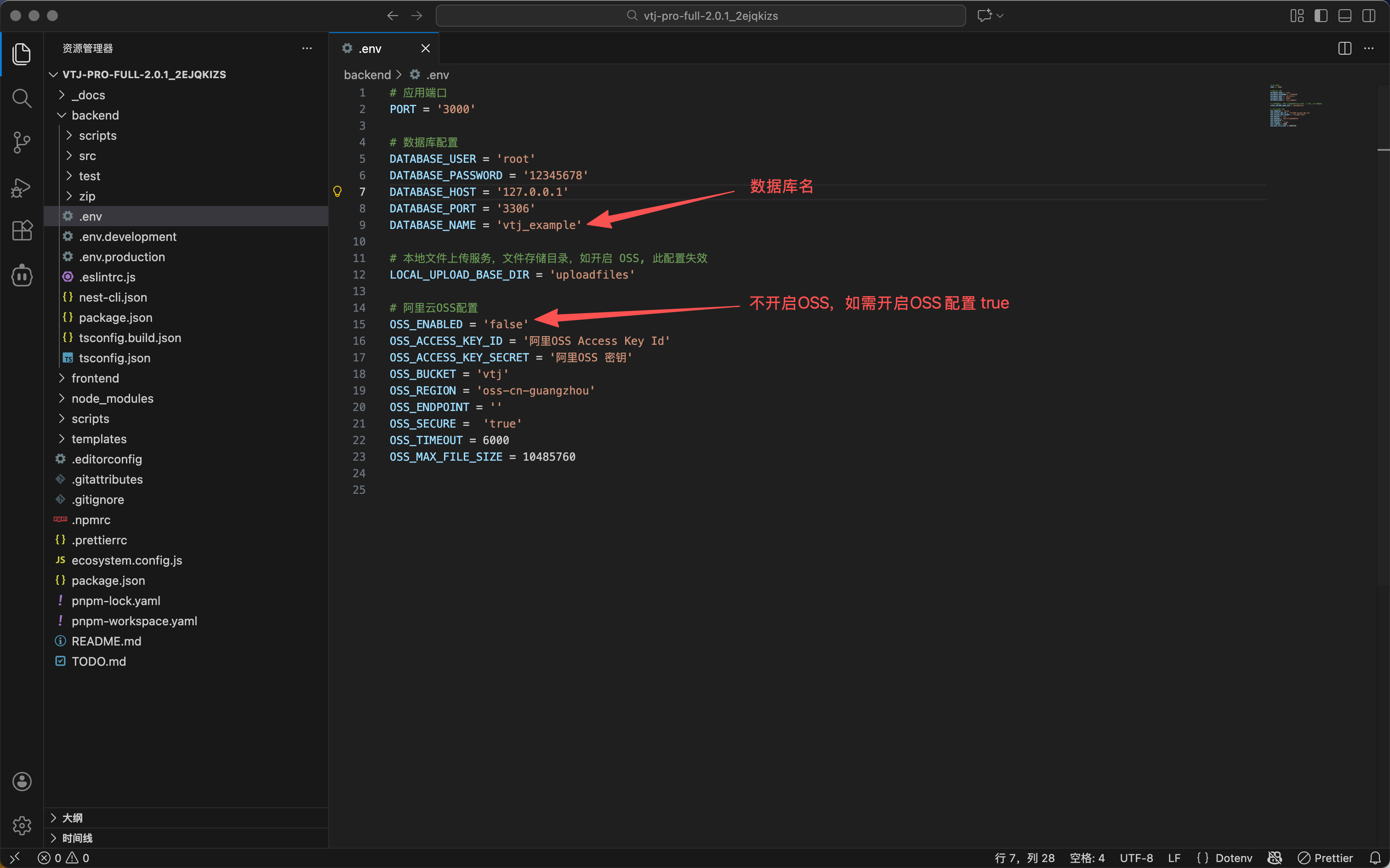 配置应用程序运行所需的环境变量,包括数据库连接、OSS存储、服务端口等关键设置。